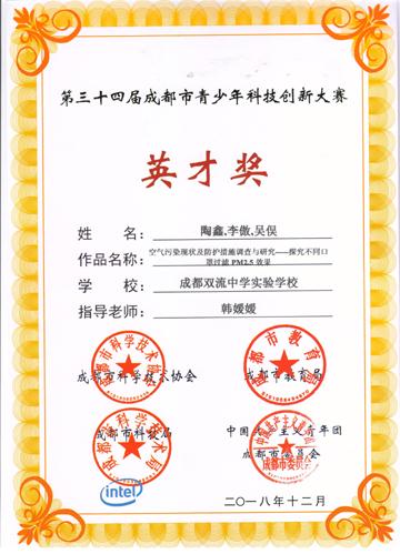 在2018年成都市第34届青少年科技创新大赛中,成都双流中学实验学校再创辉煌,学生科学论文60篇获奖,其中韩媛媛老师指导的初2019届15班陶鑫、李傲、吴俣撰写的科学论文《空气污染现状及防护措施调查与研究----探究不同口罩过滤PM2.5效果》斩获大赛最高奖----英才奖,17篇科学论文荣获市一等奖,22篇荣获市二等奖,20篇荣获市三等奖;科学影视5项作品获奖,其中3项作品荣获市一等奖,1项获市二等奖,1项获市三等奖;教师科教作品5项获奖,李雄、李举梅两位老师的2项作品荣获市一等奖,2项获市二等奖,1项获市三等奖。科学论文、科学影像、教师科教作品一等奖获奖数量均居全市初中学校第一位。另外创造发明14项获奖,其中5项荣获市二等奖,9项荣获市三等奖;科幻画6幅作品获奖,其中2幅荣获市一等奖,2幅获市二等奖,2幅获市三等奖;信息学85项作品获奖,其中8项荣获市一等奖,21项获市二等奖,56项获市三等奖。优异的成绩,充分展现了成都市科技教育示范校在科技教育方面的超强实力。