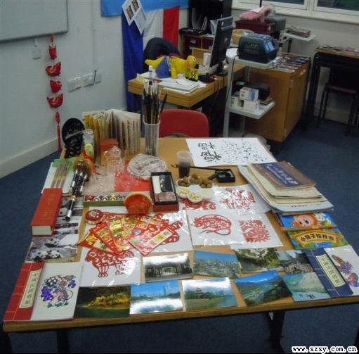 首先,回到住处,收罗的一切与中国文化息息相关的东西,如中国结,年画,葫芦丝,剪纸画,图片,食物,茶及茶具等,竟然有一大口袋,装在小行李箱中拖到了学校。下午3:30放学后就开始跟外语部的同事们set it up. 半小时搞定。