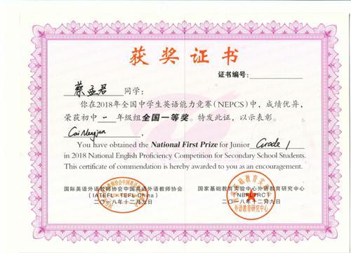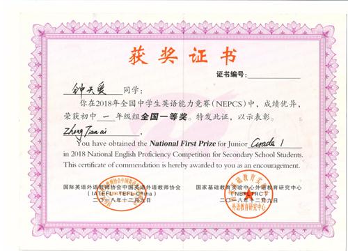 2018年度全国中学生英语能力竞赛成绩揭晓,我校2021届七年级104人取得优异成绩,4人荣获全国一等奖,8人荣获全国二等奖,15人荣获全国三等奖,17人荣获省一等奖,26人荣获省二等奖,34人荣获省三等奖。