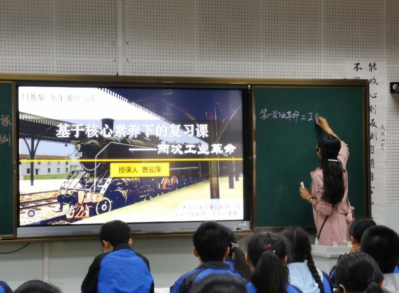 历史组晋云萍老师为本次研讨会献课,其献课的主题是“核心素养下的初三历史复习”,以两次工业革命为复习线索。为此次献课,晋云萍老师积极筹备,多方查阅资料,深入研读《初中历史课程标准》和《高中历史学科核心素养》,比较近年来成都市中考考点、考题。利用时间轴、知识树、课堂小游戏、典型史料等多种信息技术手段,培养学生的时空观念和史料实证等素养。挖掘两次工业革命重部分科学家人格要素,引用阿克莱特和瓦特人物故事,科学家们坚持、创新的品格影响了学生,春风化雨,润物无声中对学生进行健全人格教育。通过对比东西方在工业革命前后的发展进程,让学生理解了为什么落后就要挨打,为什么当今我国要深化改革和鼓励创新,培养学生历史理解。