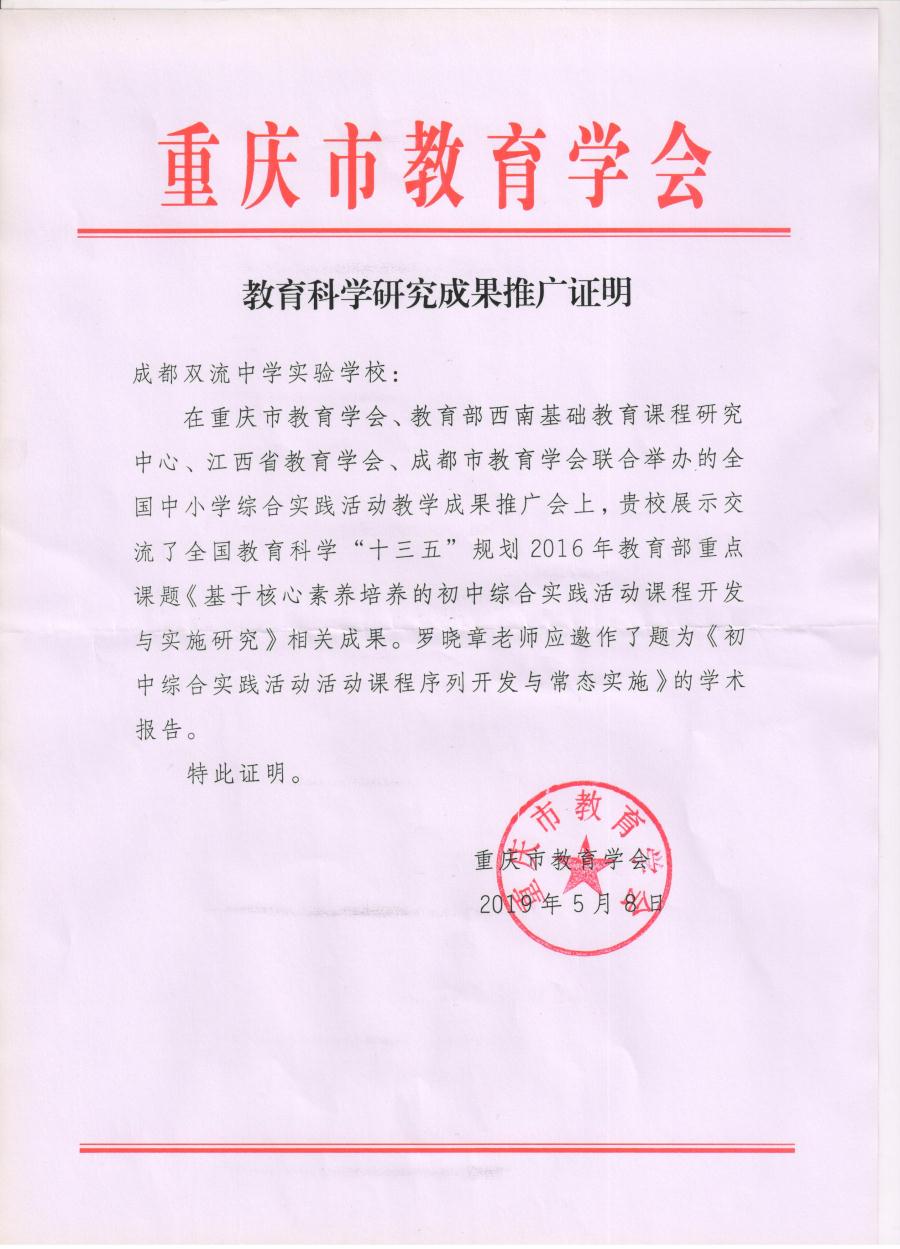 2019年5月8日,在重庆市教育学会、教育部西南基础教育课程研究中心、江西省教育学会、成都市教育学会联合举办的全国中小学综合实践活动教学成果推广会上,我校罗晓章校长助理受邀作了题为《初中综合实践活动课程序列开发与常态实施》的学术报告。
