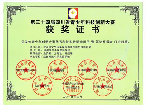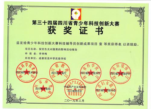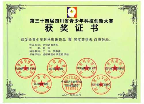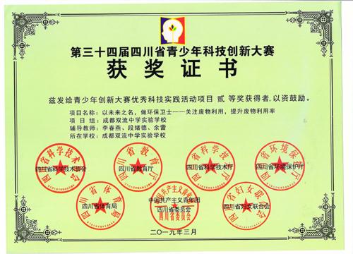 2019年3月22日至25日,在由四川省科协、教育厅、科技厅、生态环境厅、体育局、团省委、妇联和遂宁市人民政府共同主办,四川省青少年科技活动中心和遂宁市科协承办的四川省最高规格的青少年科创比赛——四川省第34届青少年科技创新大赛上,我校5件作品在与各地、市、州超200万件的初赛后选拔出来的1620项优秀作品的较量中脱颖而出,获奖情况如下表: