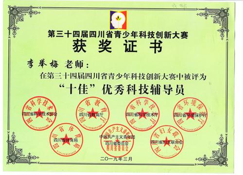 同时,李举梅老师还被评为“四川省十佳科技辅导员”,李春燕老师在大赛期间的全省科技辅导员论坛上做专题讲座,我校还被推荐参加全国“十佳科技教育创新学校”评选。