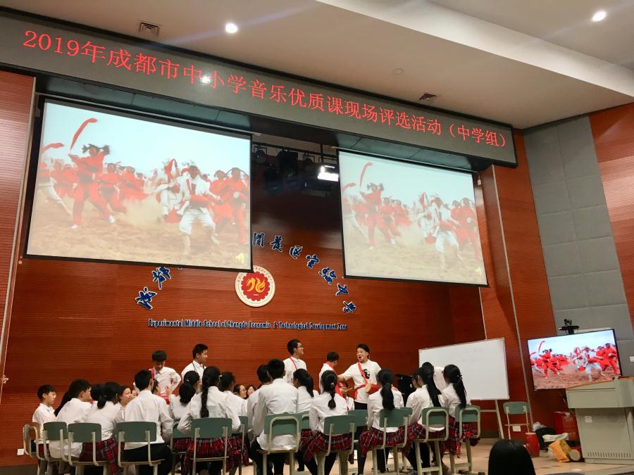 2019年5月24日成都市中小学音乐优质课中学组展评活动在龙泉驿区成都经济技术开发区实验中学举行,夏栋梁老师代表双流区参与现场展评活动。本次展评活动各个区市共选送30多节课进行PK,首轮筛选确定6位老师晋级现场决赛,通过前期艺术教研组全体教师的集体打磨,最终,比赛当天夏老师在吴玲老师全程协助下以第一名的成绩晋级四川省省级音乐学科优质课比赛。