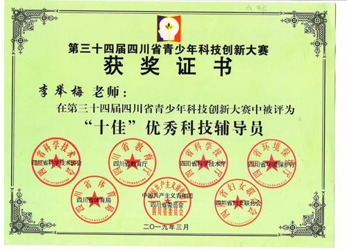2019年3月22日至25日,四川省第34届青少年科技创新大赛上,我校李举梅老师被评为“十佳”优秀科技辅导员。