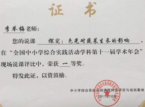 2017年12月6日全国第十一届中小学综合实践年会在郑州召开,李老师代表学校进行《探究色光对蔬菜生长的影响》现场说课比赛,荣获全国一等奖。