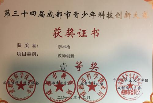 2018年10月李老师撰写的《探究色光对蔬菜影响活动报告》在成都市中小学34届科技创新大赛科教方案中荣获成都市一等奖,2019年3月荣获四川省一等奖,并入围参加全国科技创新大赛。