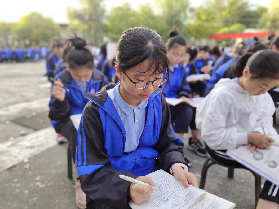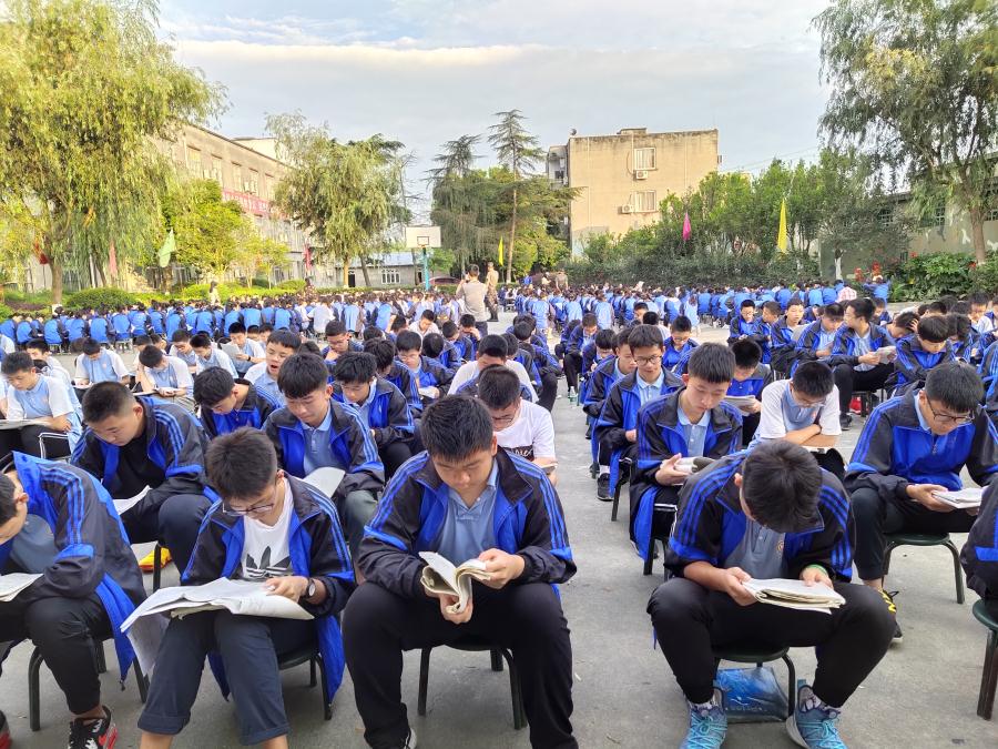 早上6:30,全体学生迎着朝阳,在操场认真复习生物和地理,各班班主任和教官们按时到场规范纪律,监督背诵,效果良好。