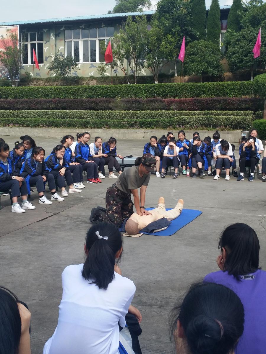 上午,同学们体验了一门特殊的课程——解放军战地救护课之自救与互救。教官现场示范心肺复苏手法,之后让每个学生都动手操作,在几个小时的训练之后,学生基本能熟练掌握各类常规包扎救护技能和心肺复苏等手法。