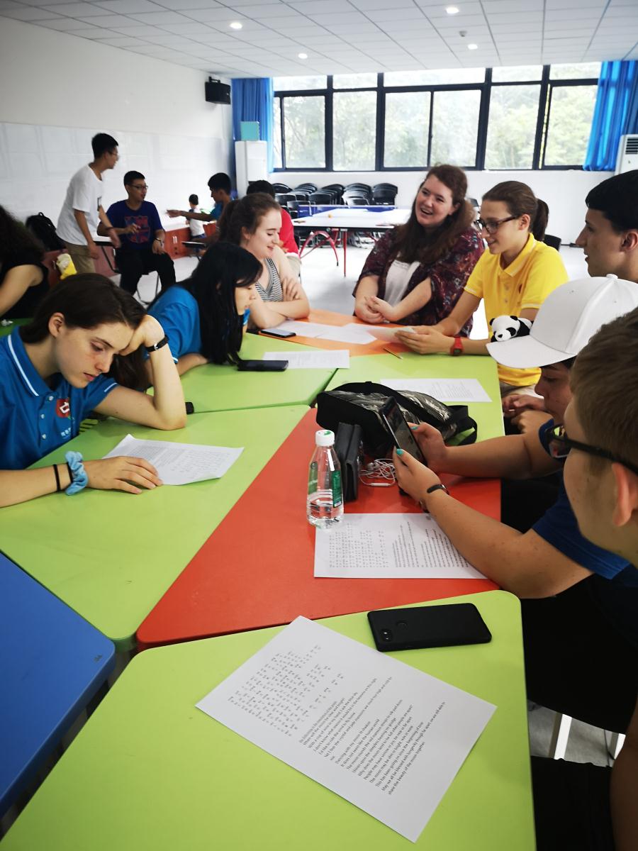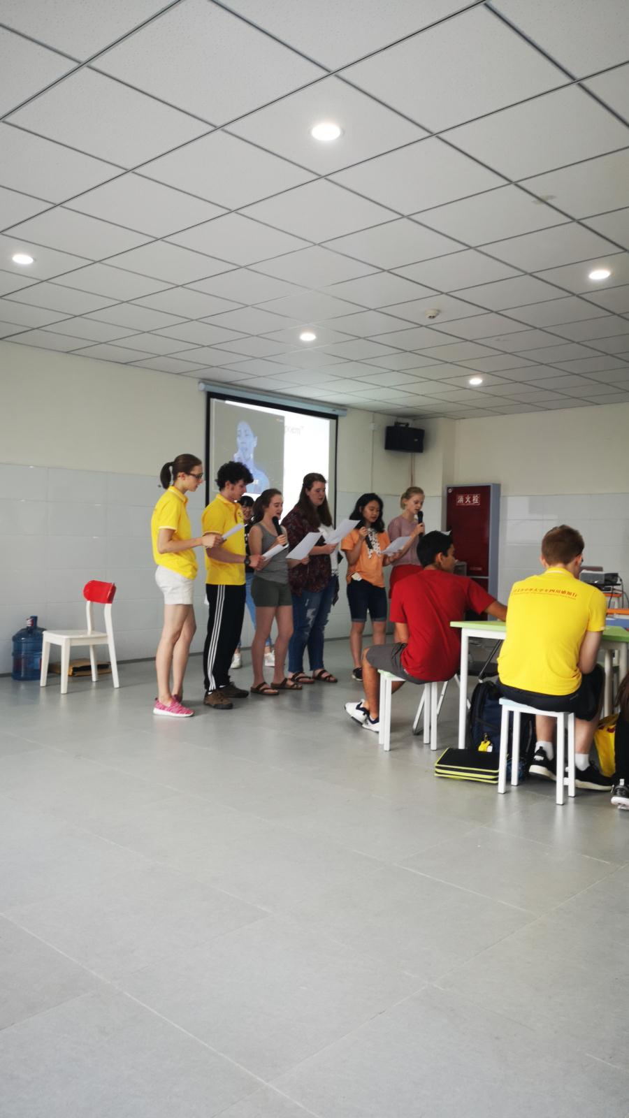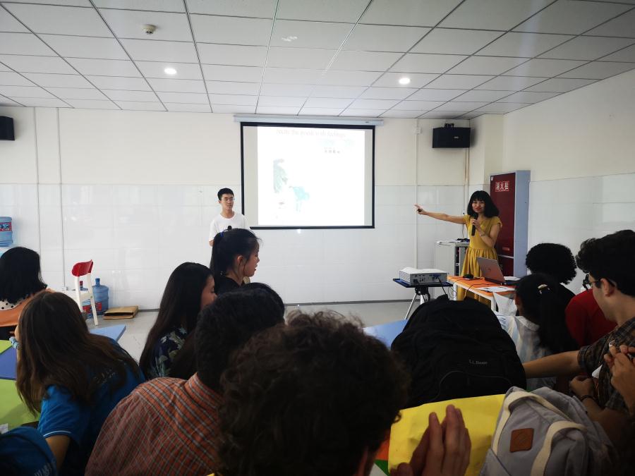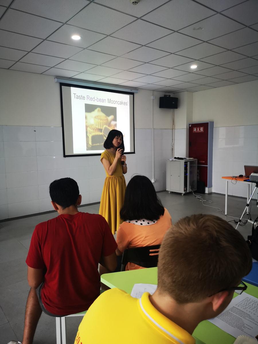 2019年7月18日下午4:00,参加NSLI-Y项目的32名美国中学生已经准时坐在了我校国际部三楼的活动里,准备参加他们期待已久的“中国传统节日--中秋节”的文化体验课。而这节课的任课教师正是我校课题组的陈琦老师。陈老师主要通过演示和讲解关于中秋节的由来、中秋节的发展、传播及意义,以及让美国学生参与中秋节的古诗《水调歌头》的朗诵、《但愿人长久》歌曲的学唱、月饼品尝等活动来让美国学生全方位感受中国传统节日中秋节的意义和庆祝中秋节的重要性。
