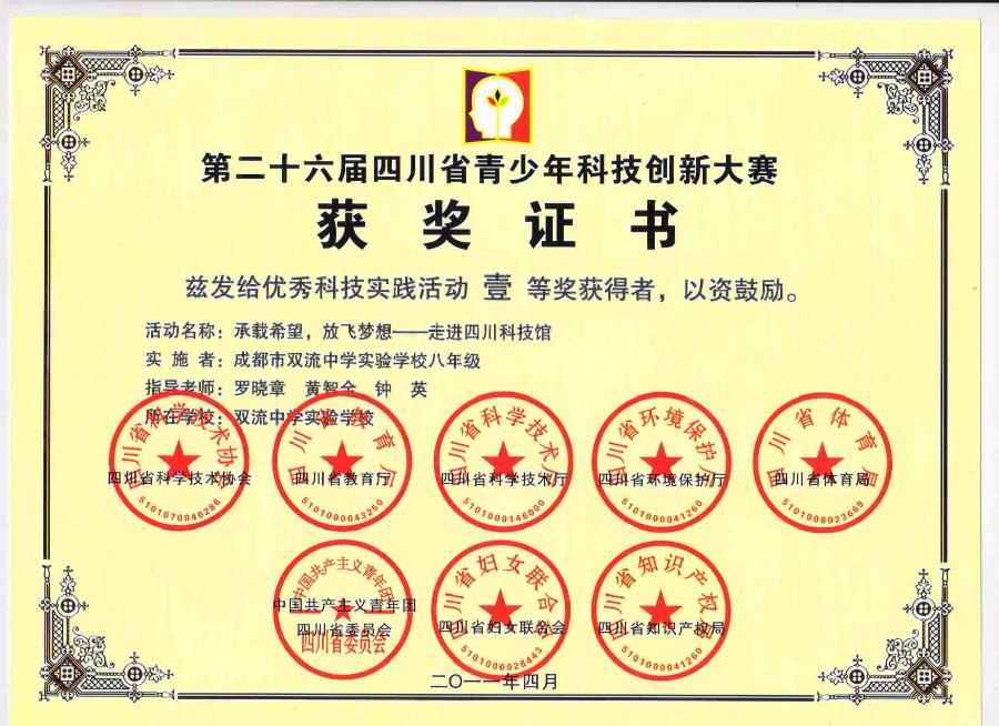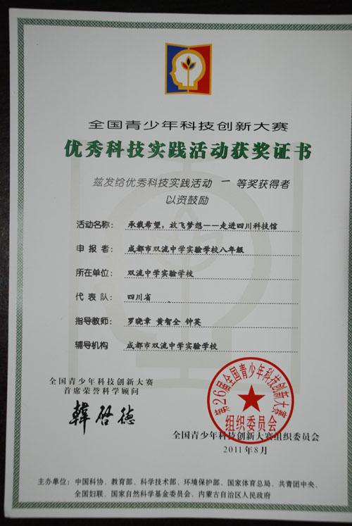 我校学生小组课题、优秀科技实践活动《承载希望,放飞梦想——走进四川科技馆》荣获全国一等奖、省一等奖。