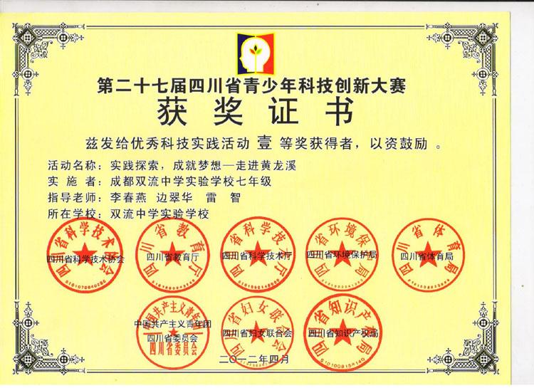 我校学生小组研究性学习课题、优秀科技实践活动《实践探索,成就梦想——走进黄龙溪》荣获全国二等奖、省一等奖。