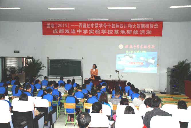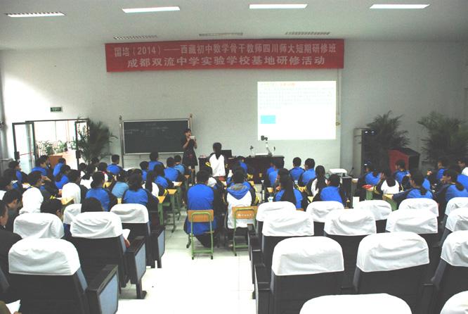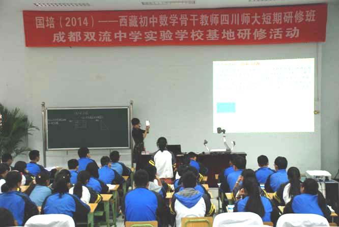 2014年9月23日,“国培计划(2014)——西藏初中数学骨干教师四川师范大学短期研修班研修活动”在我校开展。我校数学组王宗渠、余蕾两位教师分别为骨干班教师上展示课《一元二次方程的复习》《位置的变化》。在展示课的现场,王宗渠老师充分利用我校主研的市级课题《自主合作探究式课堂教学模式构建研究》的研究成果“初中数学复习自主合作探究式教学模式”进行课堂教学设计,从课前热身、本节课的知识框架图、典型问题研究、方法应用、拓展延伸、课堂小结等环节展开教学,在整个教学中让学生独立思考、小组合作交流,进而引导学生对解题方法进行归纳和总结。余蕾老师执教的《确定位置》将现实生活中常用的定位方法呈现给学生,进一步丰富学生的数学活动经验,促进学生观察、分析、归纳、概括的能力,教学过程中创设生动活泼、直观形象且贴近他们生活的问题情境,引起学生的极大关注,有利于学生对内容的较深层次的理解,为学生创造自主学习、合作交流的机会,促使他们主动参与、积极探究。两位教师充分展示了她们灵活处理教学问题,教育智慧及深厚的教学基本功。到会专家给予了很高评价,一致认为两位教师课堂真实、理念先进。
