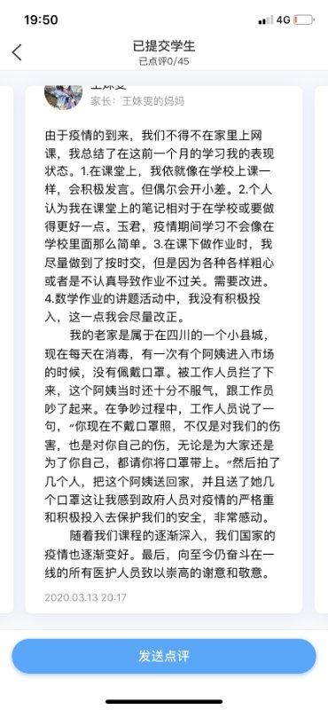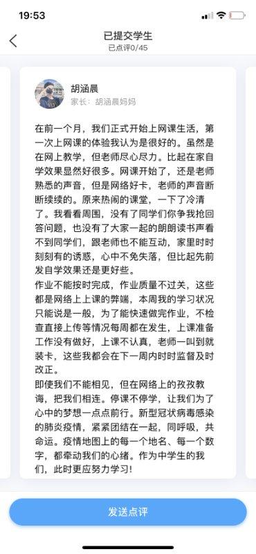 此次微班会主题是自制和自律等,首先各班主任让孩子畅所欲言宅家的各种状态然后引导孩子们从正反两方面思考和讨论宅家学习应该有什么样正确的打开方式。同学及部分家长们反响热烈,经过老师的引导和同学们的讨论一致认为越勤奋,越努力;越自律,越优秀。人生从来就没有什么好命天赐,与其羡慕他人的成功,不如让自己学会控制惰性,抵抗欲望,心无旁骛、奋力向前。