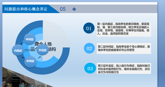 随后,高校长详细阐述了双中实验校中学部健全人格德育教育课程体系。他指出人格最终决定着人的言行倾向,决定个人发展方向,社会人格决定社会的发展方向。德育的核心就是要培养学生的健全人格,促进他们的全面可持续发展。双中实验校健全人格德育课程是从学生的心理特征出发,从内在的心理格局出发对学生实施积极的德育教育,不是强加给学生的一种模式,更不是空洞的口号。学校健全人格教育课程将人格结构的思想观念、心理特征和行为方式分成了九个方向,在此基础上进一步分化为32个要素,从而确定了学校德育工作的目标和内容体系,将空洞的目标具体化,将空泛的内容系统化。为了保证健全人格教育的常态化和序列化实施,学校开发了健全人格教育读本,系统性讲解健全人格教育;通过与学科教学融合、主题班会课序列化建设、学校大型活动课程化开发构建起学校健全人格课程体系,通过课程化实施确保学校德育工作落在实处。