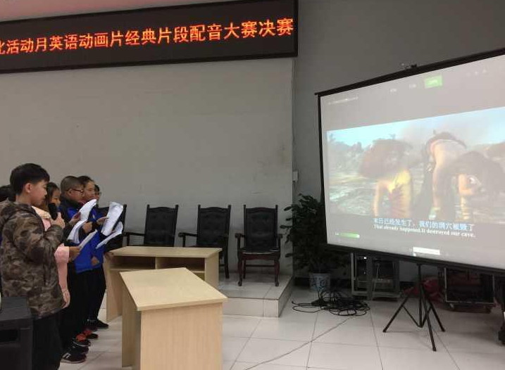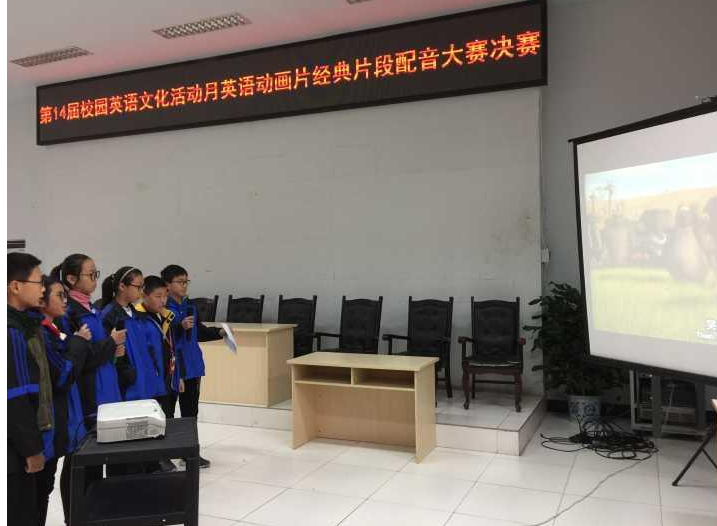 12月7日下午5:00,第14届“校园英语活动月”7年级经典英语动画片配音比赛在学校学术演讲厅举行。本次比赛,由学生自主选取3分钟的动画片段进行英语配音,《功夫熊猫》、《海绵宝宝》、《疯狂原始人》、《疯狂动物城》、《马达加斯加》、《豚鼠特工》等经典动画片经参赛队员配音演绎,七年级的同学在语言能力上的训练还不多,但也有不少同学表现得惟妙惟肖。期待他们明年更精彩的表现。