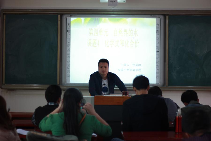 下午,代老师为巴塘中学的老师们作专题讲座——《化学式和化合价》的说课。讲座中,代老师首先对教材、学情作了详细分析,再谈该如何把握教学目标、教学重难点等,并着重讲解了该课题中8个学时的教学设计,从课堂引入到知识点的过渡,从知识点的讲解到运用等方面都做了详细介绍。深受该校老师欢迎,得到了该校领导的高度好评。