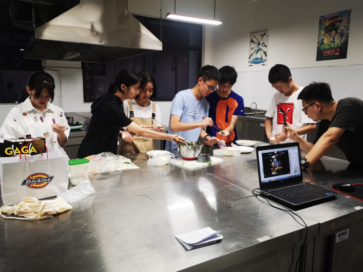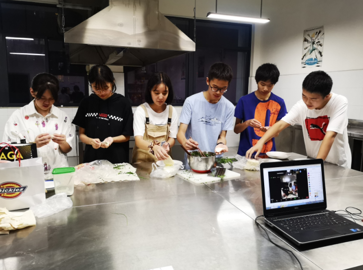 7月29日晚8点,我校六名九年级学生在高中部的烹饪教室内,为参加2020年NSLI-Y项目的美国学生带来了一堂色香味俱全的“美味饺子DIY”课程。这六名同学先用PPT向美国学生介绍了饺子是深受中国人民喜爱的传统特色食品,是中国北方民间的主食和地方小吃,每逢新春佳节,饺子更成为一种应时不可缺少的佳肴。饺子的特点是皮薄馅嫩,味道鲜美,形状独特,百食不厌。饺子的制作原料营养素种类齐全,蒸煮法保证营养较少流失,并且符合中国色香味饮食文化的内涵。饺子是一种历史悠久的民间吃食,深受老百姓的欢迎,民间有“好吃不过饺子”的俗语,并向他们展示了饺子的不同花式包法。