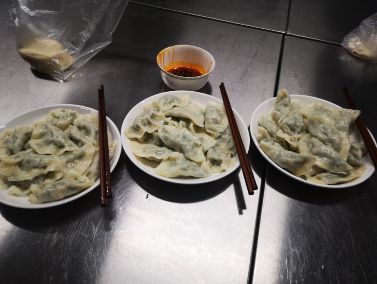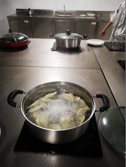 接下来几位同学就亲自操作,一步步地线上教美国学生如何和饺子馅儿,如何包不同样式的饺子;一边教一边用流利的英语向美国学生介绍注意事项。包好饺子后,倒入锅中煮熟捞起后,又继续教授如何做饺子蘸水。