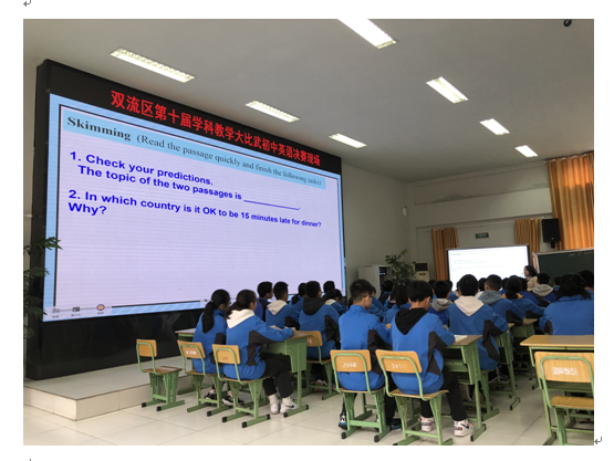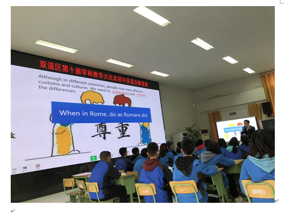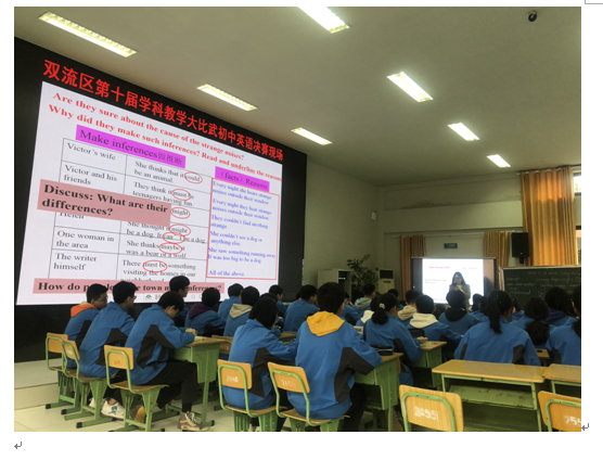 此次比赛共有来自双流区各所学校的共16位优秀选手同台竞技,我校派出了吴娟老师、代君老师、杨四维老师参赛。本次学科大比武赛课的课型主题为:Reading for language learning,程德金老师意在引领大家研讨在今后课堂教学中从知识的角度实施学习能力、语言能力提升的途径和方法。 参赛选手需深刻思考此主题,有自己的见解并在现场的阅读教学展示中突出如何指导学生感知、理解、学习、使用语言知识并提升能力和素养。第一天上午的比赛中,选手们抽到了人教版初中英语九年级第10单元A部分的阅读课,我校吴娟老师和杨四维老师第三四位出场。代君老师在第二天下午的比赛中出场,赛题是八年级第10单元阅读课。三位老师精心的课堂设计和流畅的课堂语言给评委和听课老师们留下了极其深刻的印象,向大家展示了扎实的教学功底。他们在课堂上对学生耐心指导、循循善诱,既尊重了学生的主体性,又启发了学生的思维和积极性,更激发了学生的创造性。同时又注重对教材文本的分析和深度挖掘,突出了在情境、语篇中学习语言;还特别注意了以问题来推动学生思考,不时与学生碰撞出精彩的火花并在情感上与学生有共鸣。三位教师的教态自然、课堂富有个人魅力和激情,整堂课一气呵成;同时三位老师都将我校的健全人格理念,小组探究学习的方式融入教学环节中,向各兄弟学校充分展示了双中实验英语教学的风采。