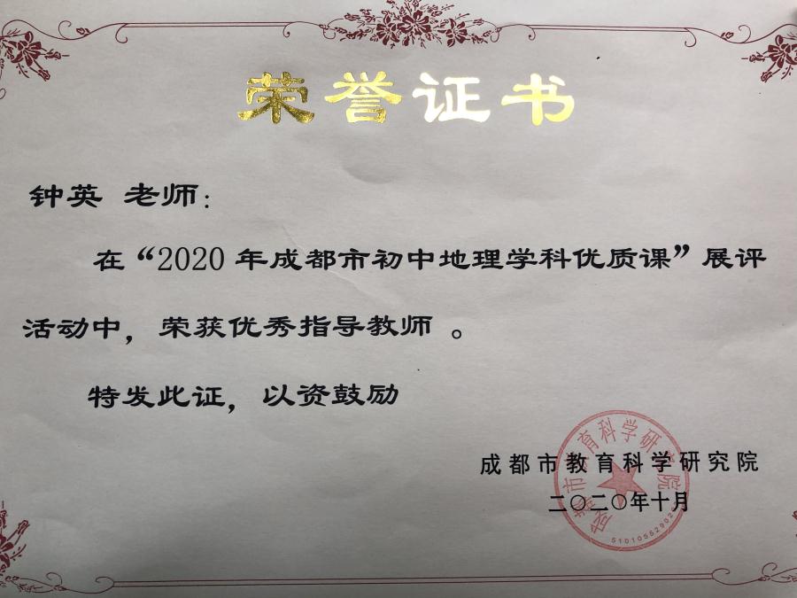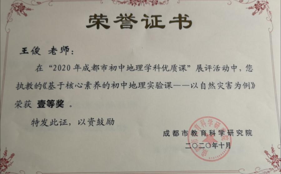 可喜可贺的是,本次会议中我校王俊老师执教的《基于核心素养的初中地理实验课——以自然灾害为例》一课获得“2020年成都市初中地理学科优质课”一等奖,钟英老师荣获“2020年成都市初中地理学科优质课”优秀指导教师。(地理组 丁翔)