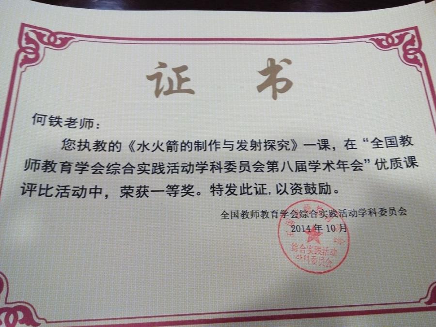 本届年会上,我校除何铁老师的现场展示课、龙姿君老师现场说课荣获一等奖以外,学校课题组研究成果还分别在各类成果评选活动中获奖。学校被评为“2014年全国综合实践活动先进集体”(全省共六名);在优秀研究论文评比中,我校共有10篇论文荣获一等奖,15篇荣获二等奖;在论文收录与发表方面,杨四维、李东萍、朱春烨等老师的八篇论文发表于国家级期刊,全国范围内单个学校发表数量最多的;在视频录像课例评比中,罗晓章、叶平、罗远洋、龙姿君、杨四维五位老师的四件课例荣获一等奖,丁翔、韩科、雷智等8位老师的课例分获二等奖。