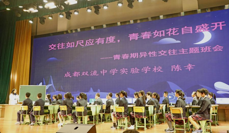 成都双流中学实验学校名优教师、成都市优秀班主任陈幸老师的健全人格教育主题班会课,以班级管理子课题组在前期调研的八年级学生普遍存在的男女生人际交往困惑与障碍,而学生又苦于无法合理地把握男女生交往尺度的学情现状为主题,设计了初中男女生人际交往的主题班会课《交往如尺应有度,青春似花自盛开》。陈幸老师的这堂课通过“0.49米的距离”的体验活动,让学生在现场亲身感受合理的和不合理的异性交往距离的差异,从而明白异性交往的适当的社交距离;让学生描写自己理想中的异性并观看林徽因和梁思成的爱情经历,从而让学生努力将自己打造成为一个拥有独立精神世界的人;让学生把对理想中的另一半的美好期许写进时间胶囊封存起来,为了遇见更好的对方而树立努力奋斗的远大志向,引领学生思考青春期异性交往的尺度以及如何成为更好的自己——不负青春不负卿。