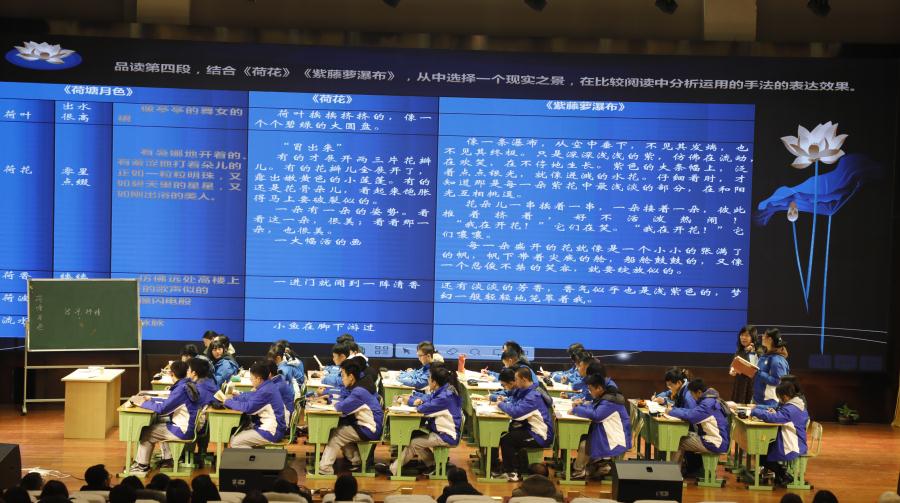 文科分会场,首先登场的是山西省首届教学名师、山西省学科带头人、山西省教学能手、成都双流中学实验学校高中语文李劲梅老师。李老师基于高一上期学生学情,将小学《荷花》、初中学段《紫藤萝瀑布》两篇有生发延展价值的文本,引入高中课堂,进行了“寻找最美的风景——‘一篇带多篇’的群文阅读”教学。联结整合,寻共性品细节,比相同析异处,以旧解新,以点带面,寻找写景抒情的切入点、思考点。用大概念进行整合性教学,根据写景抒情散文阅读与写作的核心任务确定大概念:如何读懂景中情,如何做到情景交融——培养和提升由此及彼的联想思维能力。课堂教学中,李老师用思维开启课堂,用情境引领课堂,用活动延伸课堂。通过激趣启思、鉴赏品味、群文聚焦、写作迁移、整本书阅读推荐五个教学步骤,层层递进地实现了在不同学段的知识迁移中催生高阶思维、学生语文核心素养的四个维度的培育。