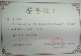 在2014年北师大版教材学科课件评比活动中,我校生物组有4位老师获奖,其中蒲明海老师的《蒸腾作用》、雷智老师的《血液循环》分别荣获一等奖,陈晓红老师的《植物呼吸作用》、王丽君老师的《鸟类的生殖和发育》荣获二等奖。(生物组  雷智)