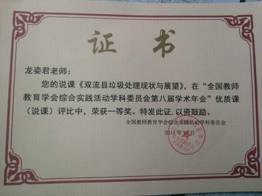 龙姿君老师代表我校参加第八届综合实践活动学术年会说课评比,龙老师以《双流县垃圾处理现状及展望》为课题,从课堂的教学流程和学生活动的设计思路出发,最后以《餐厨垃圾和固体垃圾处理》为案例详细的介绍了我校研究性活动的开展情况,受到了评课专家的高度肯定和赞扬,最终勇夺国家级一等奖。
