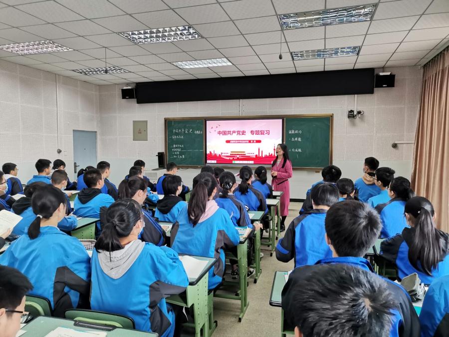 首先是校优秀历史教师李然针对时政热点——中国共产党成立一百周年,进行了课例展示。课前,李然老师对“课标”、“核心素养”“教学评一致性”的相关政策理论进行了深入的研究,并将其中的核心理念渗透于教学环节之中;课堂中,李然老师以时间轴、丰富的史料、典型的例题、应答的技巧等要素串联本课,有的放矢,为学生应对中考创设了良好的情境。