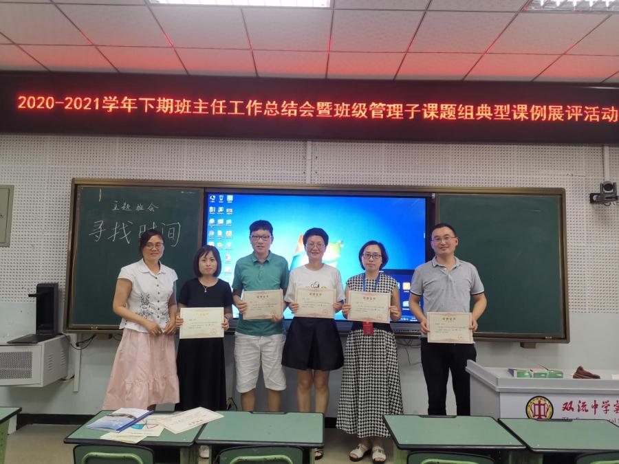班级管理课题组的本学期课题研究的总任务是在努力把握《健全人格课程纲要》精髓、学习有关先进理论和新课程理念的基础,进一步深化以“健全人格教育”为核心的主题班会课程体系以及相应的班会课程体系,积极打造特色精品班会课,进一步使得我校德育课程序列化、活动化,有针对性和实效性。德育处王主任为班级管理课题组下一阶段的工作重点提出了中肯的指导意见并在本次班主任工作总结会上主持了本学年主题班会“人人献课”活动一等奖的颁奖仪式,并为获奖老师们颁奖。(图文来自 徐然)