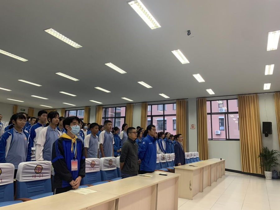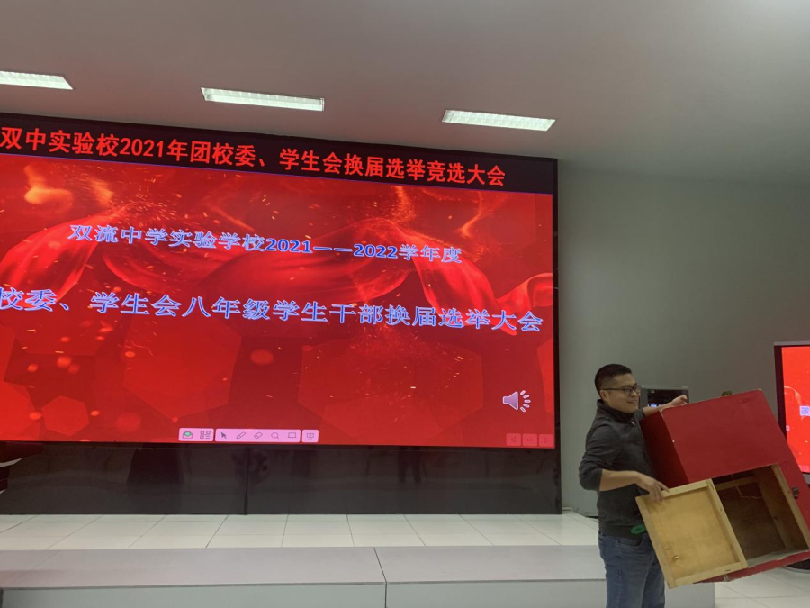 双流中学实验学校团校委、学生会于2021年10月13日(第八周星期三)下午18:00,在学术演讲厅召开八年级学生干部换届选举竞选大会,到会的各位领导、老师,他们是:共青团双流中学实验学校委员会书记王俊老师,双流中学实验学校德育处黄德洪老师、谢华老师、彭钰老师。金秋十月,硕果飘香,在这青春激扬、不断奋斗的时节里,我们齐聚一堂,共同见证双流中学实验学校2021——2022学年度团校委、学生会八年级换届选举大会