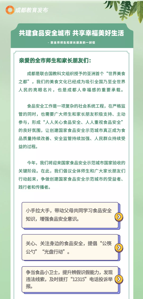 聚焦! 共建食品安全城市 共享幸福美好生活 | 致全市师生和家长朋友的一封信