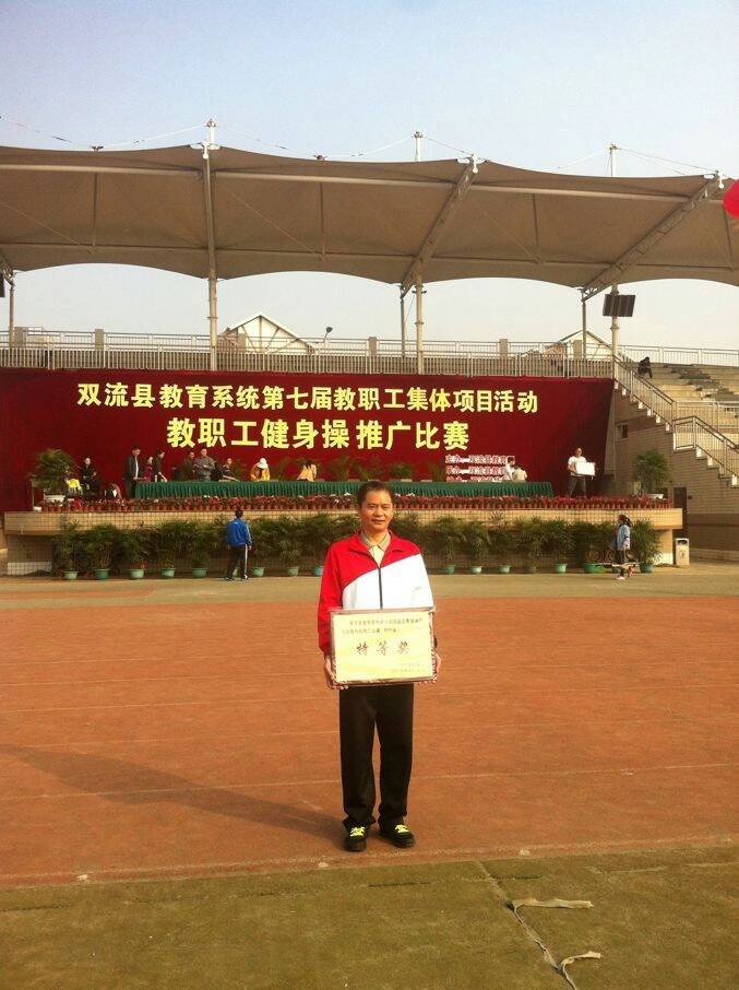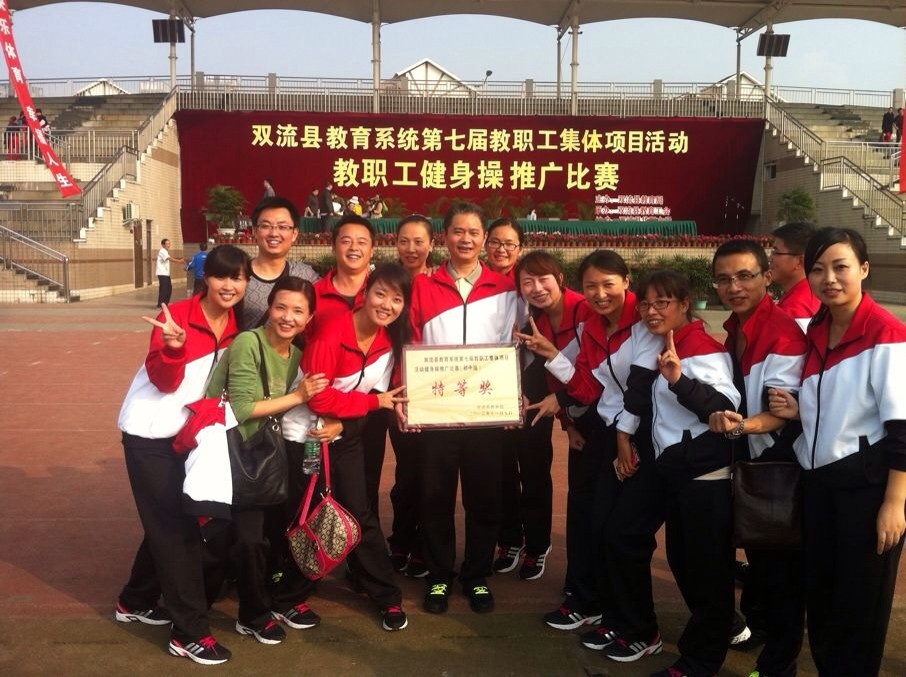 2013年11月9日,对于双中实验的教师来说,这是一个激动人心的日子,因为在这一天,我校教职工代表队参加双流县教育系统第七届教职工集体项目——健美操比赛,以初中组第2名的优异成绩勇夺初中组特等奖。在训练时间和次数极为有限的情况下,我校教职工代表队能取得如此辉煌的战绩,离不开学校领导的大力支持,教练的精心教学与编排,以及全体队员的刻苦训练等。赛场上队员们激情澎湃的表演,不仅展现了双中实验教师个人的风采,更赛出了双中实验教师团结协作和勇于拼搏的精神。
