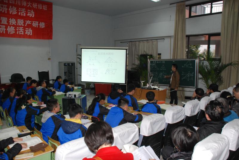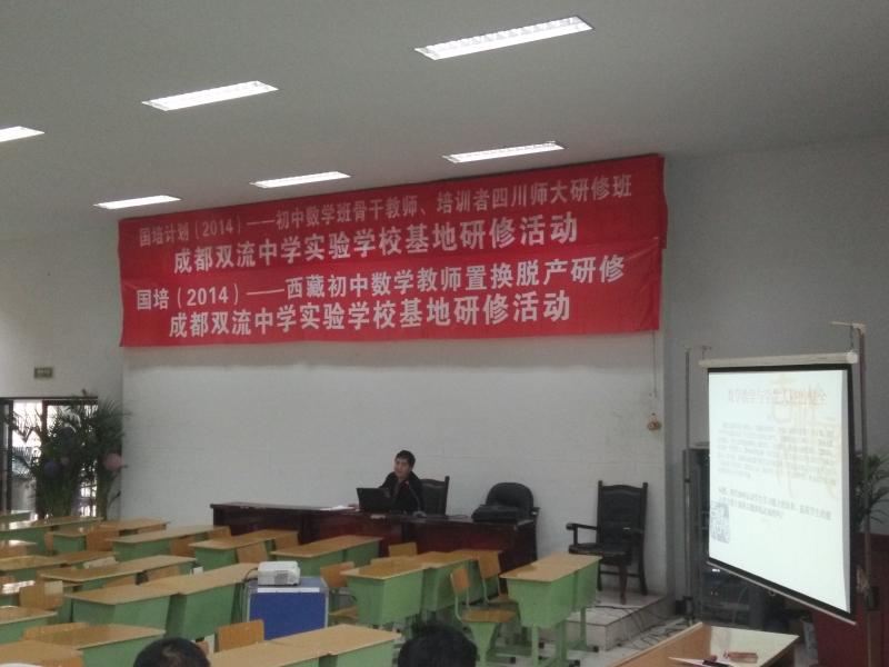 2014年11月24日国培(2014)初中数学班骨干教师、培训者四川师大研修班、西藏初中数学教师置换脱产研修——双流中学实验学校基地研修活动的教师在李昌勇教授的带领下到我校开展研修活动。我校数学教师万静、熊朝晖、杨明三位教师分别为教师上了展示课《简单面积问题》、《反比例函数性质》、《面积问题的初探》,本次活动三位教师以数学班为载体,教学中充分体现了新课程理念,灵活运用数学教研组研究成果《自主合作探究课堂教学模式》,展示了他们灵活处理教学问题的教育智慧及深厚的教学基本功。到会专家一致认为三位教师课堂真实、教学理念先进,给予了很高评价。当天下午我校数学教研组组长罗宗绪、副组长陈国华分别还为骨干教师们作了专题报告《自主合作探究课堂教学模式——试卷讲评课模式》、《数学教学与学生人格健全》,得到了与会专家的高度认可,最后由李昌勇教授对本次研修活动进行总结,大会圆满结束!