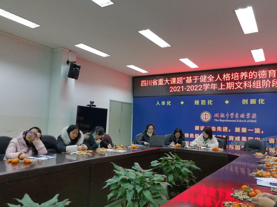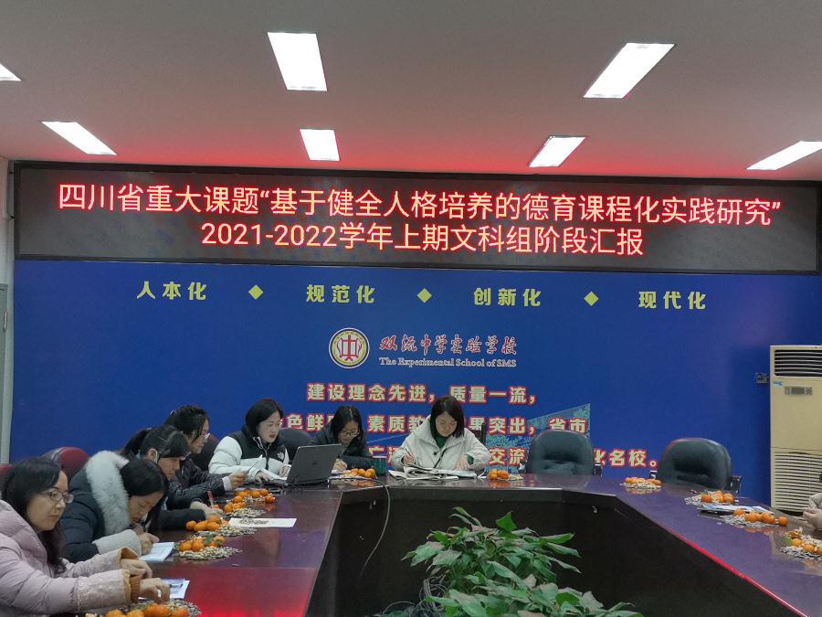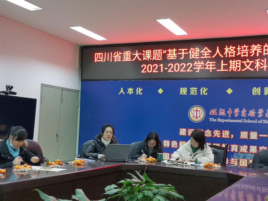 2021年12月22日下午4:00,“四川省重大课题‘基于健全人格培养的德育课程化实践研究’ 2021-2022学年上期文科组阶段汇报”会议在双流中学实验学校三会议召开。来自语文、英语、道德与法制、历史、地理、艺术六个学科的教研组长和课题研究骨干教师,在文科组长张玉萍老师的主持下参与了会议。