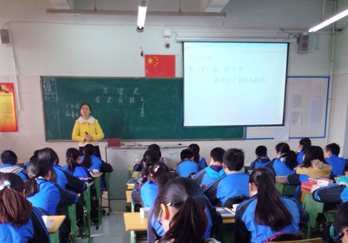 杨婷老师讲授的课文是《石壕吏》。杨婷老师运用了我校古诗文教学的课模来展开教学:一读,读准字音,读清句读;二读,理解词义,疏通文句;三读,涵咏语言,探究意蕴,深入文本分析诗歌当中的人物形象,体会藏问于答得写作手法;四读,读出作者,读出自己,体会诗圣杜甫忧国忧民的情怀。最后在同学们的齐诵声中下课。整堂课思路清晰,学生参与的积极性也很高。