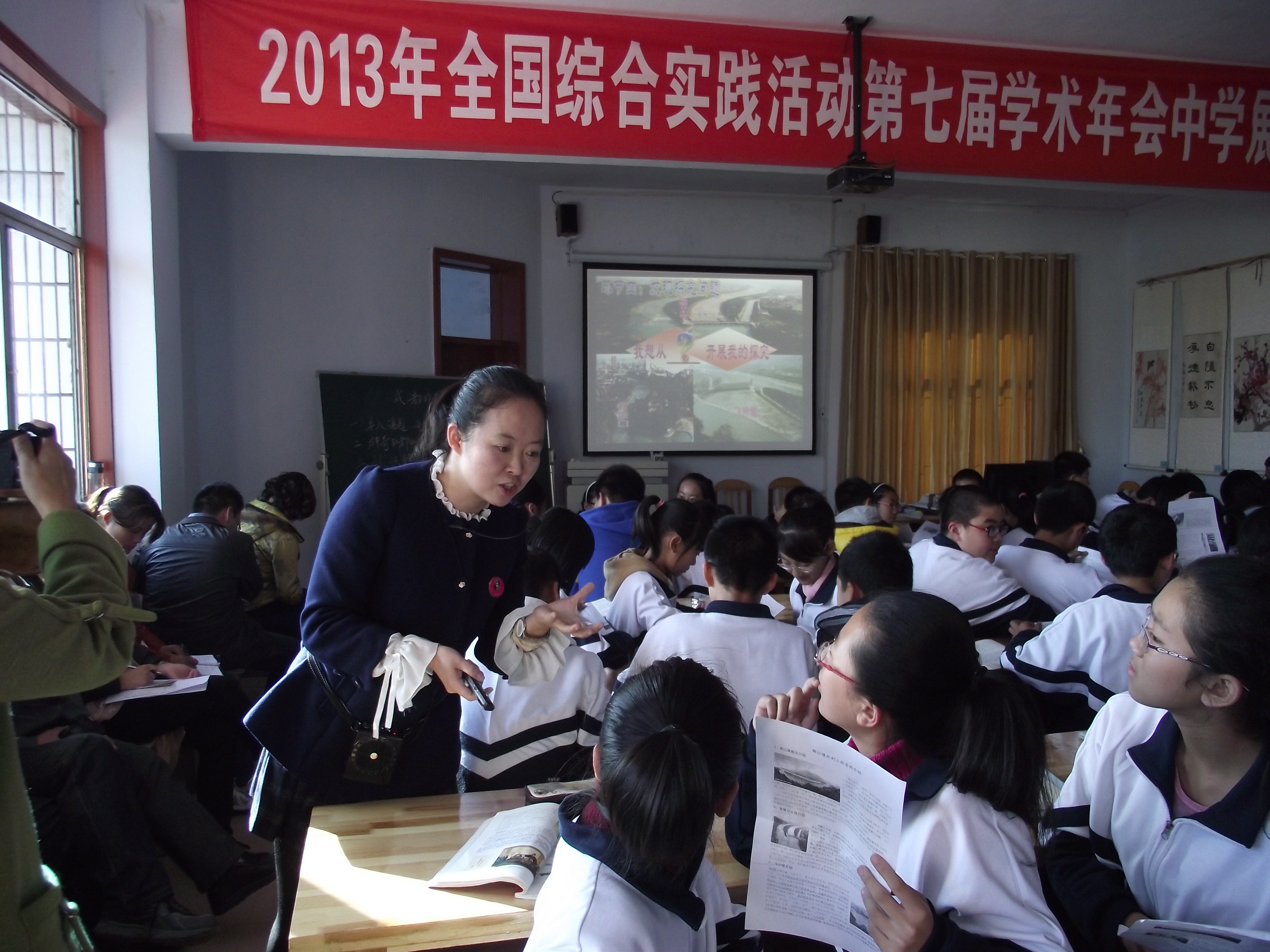 开课前,张玉萍老师首先播放了一段《成都印象》宣传片,向听课学生和全场代表直观的介绍了成都,深深的吸引了学生和代表的注意力。正式开课,张老师由天府之国美名渊源引入本堂课的研究对象——都江堰,进而师生互动全面介绍都江堰。张老师用生动的影音图画等资料充分调动学生的学习兴趣,激发学生的探究欲望,引导学生提出想要探究的主题或方向;随后,张老师系统归纳学生提出的问题,根据学生意愿,分组指导子课题研究方案的撰写。整堂课内容充实,气氛活跃,教学手段多样,师生互动密切,教师课堂调控到位,学生主体性和教师指导作用体现充分,很好的展现出我校综合实践活动课程实施的优秀做法,精彩的展现了张老师扎实的教学功底和教学艺术,博得与会专家和全国代表高度赞赏。来自福建鼓楼的教研员在课后交流中说道:“张老师的这堂展示课,真正为中学综合实践活动课课程的开发与实施提供了一个典范,是真正有利于区域推进的值得推广学习的实实在在的典型课例。”