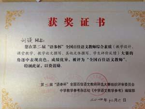 我校语文教师刘瑛在海选的基础上,从“教学设计”、“课堂教学”、“教学论文撰写”、“其它文体撰写”、“学生评价反馈”五个参赛项目中,以综合得分名列前茅的优异成绩,从300名最终入围教师中脱颖而出,被授予“全国百佳语文教师”称号。