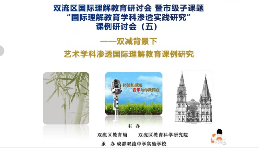 为推进双流区国际理解教育有序开展,落实市级课题“基于国际理解的中外人文交流课程建设和实践研究”子课题《国际理解教育学科渗透的探索与实践研究》在全区中小学进行更深入研究,4月14日上午由成都市双流区教育局、成都市双流区教科院主办,成都双流中学实验学校承办的“双减”背景下艺术学科渗透国际理解教育课例研究活动,通过师培通观课与腾讯会议相结合的方式在线上举行。