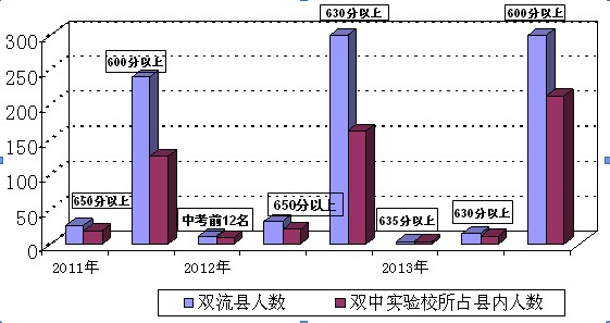 自主合作探究式课堂教学模式改变了“教”与“学”的行为,提高了教育教学质量,我校连续保持中考的各项指标全县第一。2011中考, 630分以上我校20人(全县共27人);2012年中考,650分以上我校22人(全县34人);2013年中考,630分以上我校12人(全县共16人)。2014年成都市中考, 640分以上我校42人(全县50人);620分以上我校203人(全县317人);600分以上我校456人(全县832人)。