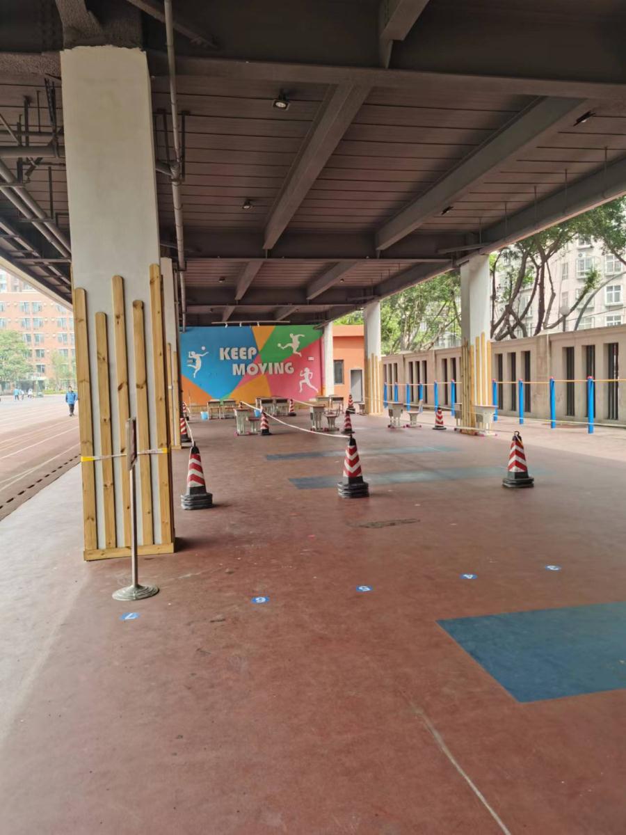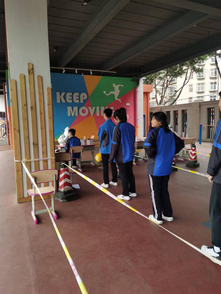学校在高中部楼下场地设立核酸检测场地,设立场地进口、登记区、采样区、场地抽口等位置。每天14点学生和教职工分批次分时段到达检测地点,在安全处和德育处值班教师的指挥引导下,大家主动配合,依次扫码、登记、采样,整个过程井然有序。