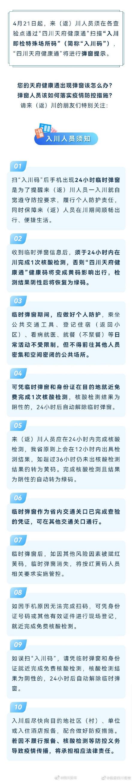 4月21日起,来(返)川人员须在各查验点通过“四川天府健康通”扫描“入川即检特殊场所码”(简称“入川码”),“四川天府健康通”将进行弹窗提示。您的天府健康通出现弹窗该怎么办?弹窗人员该如何落实疫情防控措施?请来(返)川的朋友们特别关注: