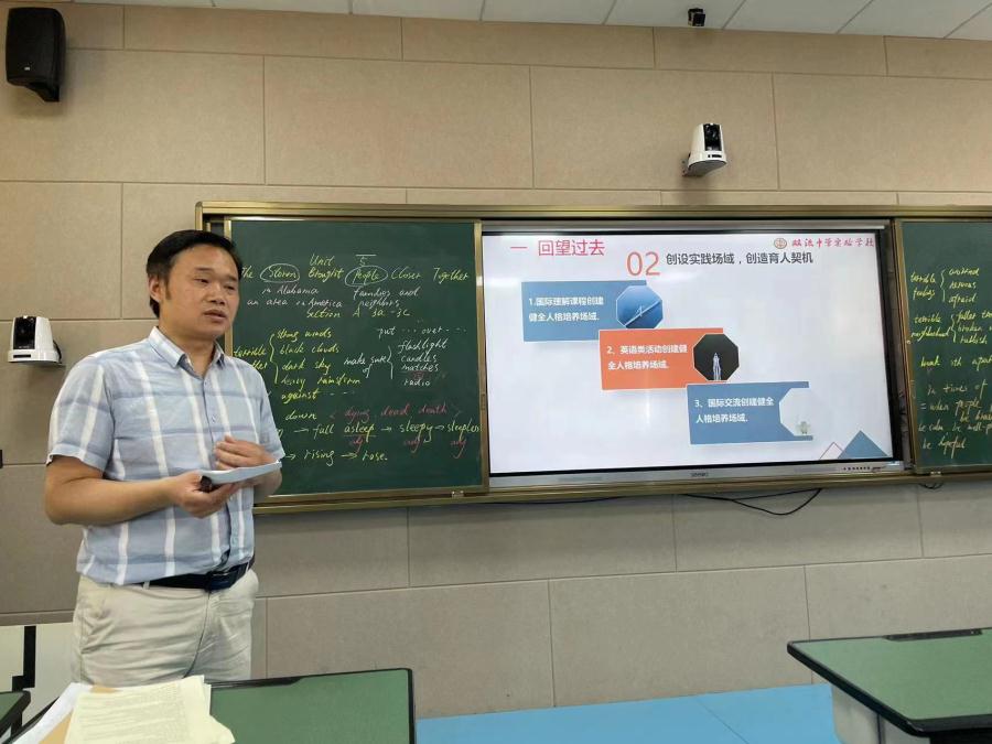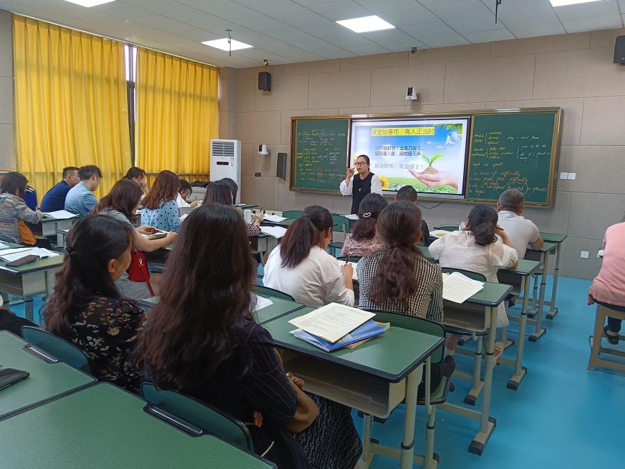 在随后的课题研讨中,谭虹涛老师代表健全人格组做了“回望,展望,践行”的专题发言。谭老师在发言中衷心感谢了英语组全体老师为课题研究推进所做的各项工作,转达了学校各级领导对英语组课题研究取得的成绩的肯定与表扬。随后,谭老师回顾了英语组课题研究的阶段性成果,全组老师对健全人格典型课例常态化实施的路径和策略充分认可,对英语组老师在各级各类赛课和论文评比中获奖感到骄傲和自豪。在对课题研究的展望中,谭老师提出了今后典型课例的建设方向:坚持英语学科本位,决不能因为渗透健全人格而偏离学科中心,为“健全”而“健全”;在今后的教学实践中,以课堂活动为基本路径通过“ 问题驱动,主体参与”基本模式突出学生主动感知与体验,老师的模范与引领,创造宽领域,多层面的育人场域。最后谭老师以“课堂如春雨,育人正当时。”对大家提出了期待。