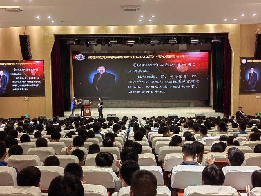 随着中考临近,为帮助九年级同学们缓解近段时间以来的紧张情绪和学习心理压力,以良好积极的心态面对中考,5月8日晚,我校在多功能厅举行了中考考前心理辅导活动,邀请四川大学心理研究所主任陈智教授作了以“培养积极心态,绽放最美自己”为主题的心理辅导专题讲座。