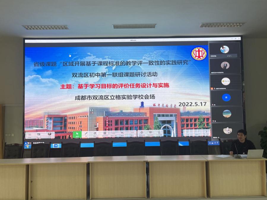 2022年5月17日下午,双流区“教学评一致性研究”初中一组科研共同体研讨活动在成都市双流区立格实验学校学术厅举行,受疫情影响,采用“线上+线下”相结合的方式。本次研讨活动由韩科老师主持,主题是“基于学习目标的评价任务设计与实施”,成都市双流区教科院初中数学教研员李志江老师,成都市双流区立格实验学校、成都芯谷实验学校、西航一中、西航二中“教学评一致性研究”课题负责人、主研教师和初中数学教师参与了本次研讨活动。