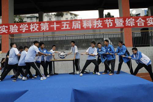 当然,我们七八年级的同学也不甘示弱,他们带来了拔河角逐也无法破解的“马德堡半球实验”,无形的“武林秘籍”——空气炮实验以及发射热情的伯努利机关枪,这些有趣有“智”的实验让同学们在眼花缭乱中开阔了视野,亦激发了其对科学的兴趣。