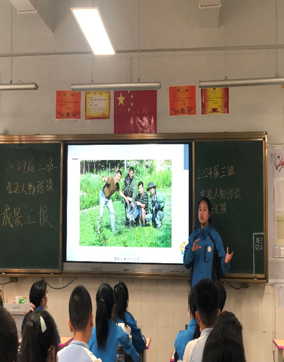 生涯人物访谈。本学期七年级同学开展“生涯人物访谈”活动。5月6日,由各班导师利用班会课就生涯人物访谈的意义以及如何进行生涯人物访谈等向学生进行宣讲,并布置任务。课后学生确定人物,进行访谈,并根据访谈内容制作小报。5月27日,班会课由导师指导学生在班级进行汇报展示。