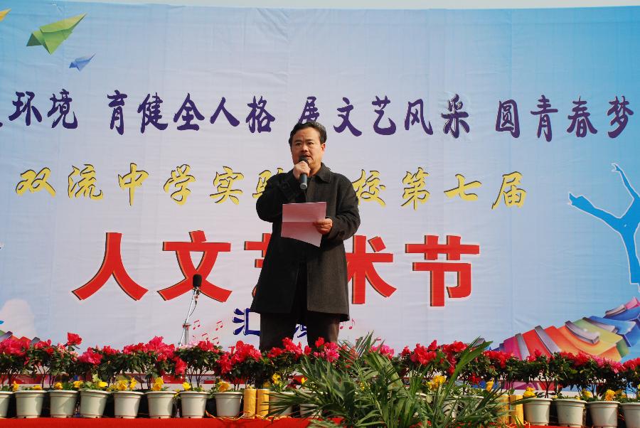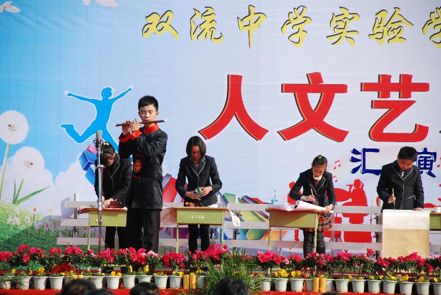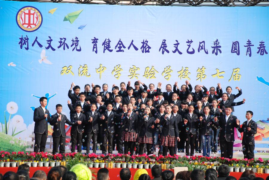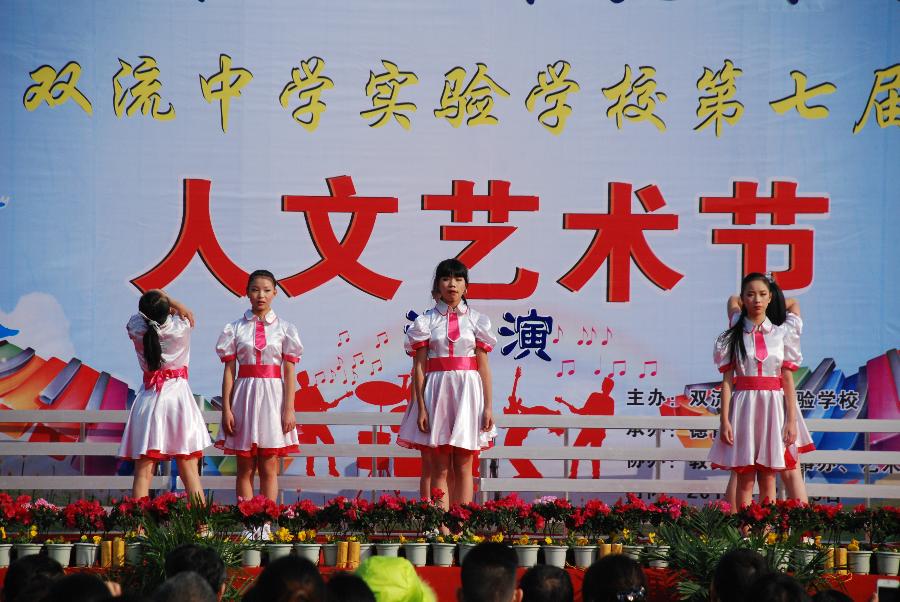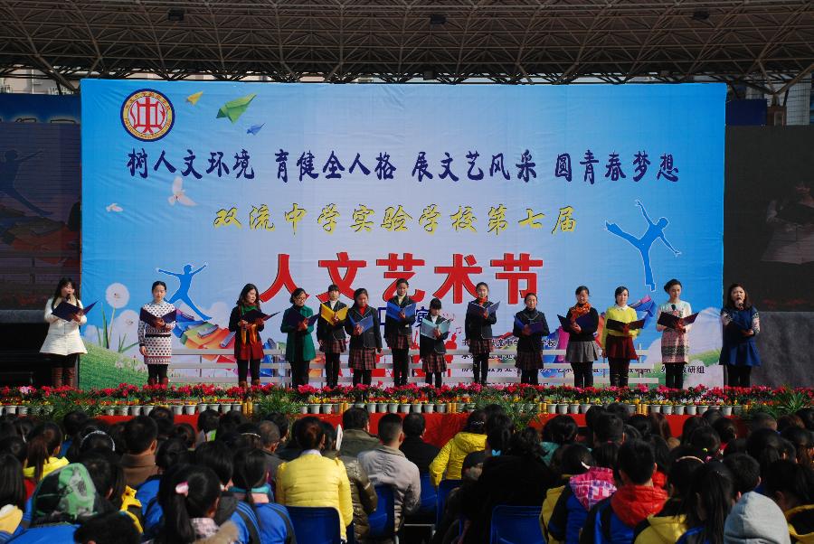 “树人文环境,育健全人格,展文艺风采,圆青春梦想。”19日下午,冬日温暖的阳光洒满广都大地,在双中实验学校操场上,一场绚丽多彩的演出打动着现场的每一位来宾及全校师生、学生家长代表——双中实验校第七届人文艺术节汇报展演,经过两个多月形式多样、异彩纷呈的全校性分组活动,至此进入最后的精彩篇章,15个精心准备的节目,犹如15集精彩的电视连续剧,引人入胜,高潮迭起,一场悦人耳目的视听盛宴伴随现场观众度过一段愉快的周末时光,也把师生们多才多艺的风貌展现得淋漓尽致。